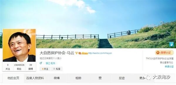 马云这个人最懂什么公关、什么是噱头、用什么来标榜自己,特别喜爱打造各种人设。比如这种“环保人设”——他曾经微博的名字还是“大自然保护协会”。