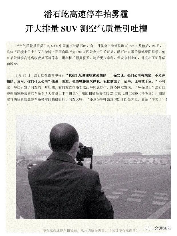 信了资本家的屁话,是要过错年的。再说一个以环保来标榜自己的小丑——潘石屹。当年美国大使馆公布了北京的pm2.5数值,跟骆家辉一家人不说两家话的潘石屹等公知纷纷鼓噪,然后这货开个大排量SUV上高速去检测空气……这不就是只许州官放火,不让百姓点灯嘛。