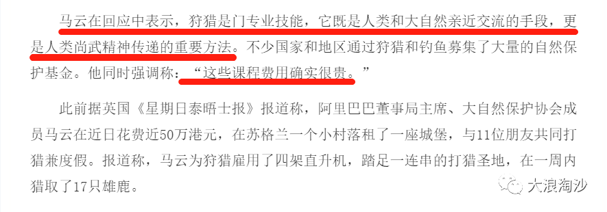 对此马云大方承认,并表示:“狩猎是门专业技能,它既是人类和大自然亲近交流的手段,更是人类尚武精神传递的重要方法。不少国家和地区通过狩猎和钓鱼募集了大量的自然保护基金。”他同时强调称:“这些课程费用确实很贵。”