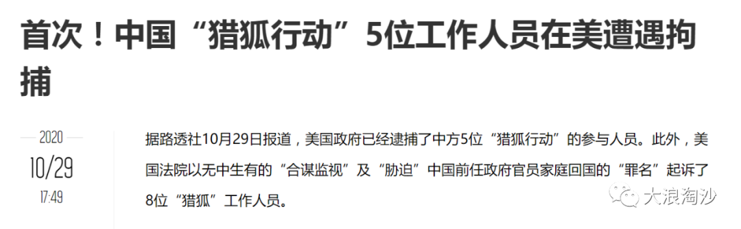 10月29日,美国流氓出手了,我方五位“猎狐行动”的工作人员在美被拘捕。明眼人都看得出来,这是特朗普政府为即将到来的大选造势,但是美方还是嘴硬,又打出“人权”的大旗,说我们侵犯那些在逃贪污犯的隐私了。