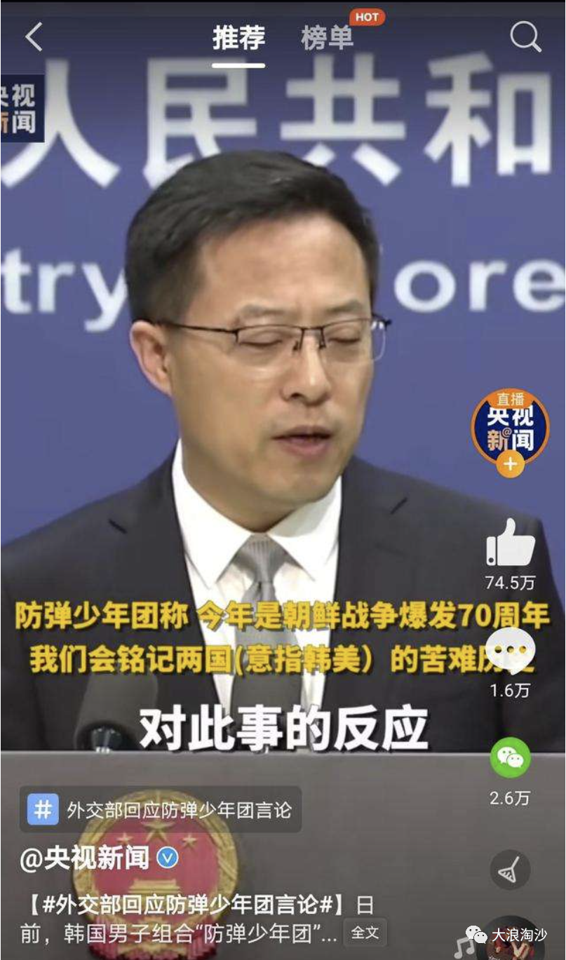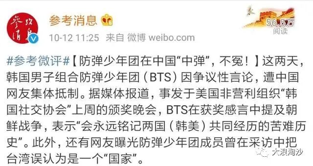 最后,就涉及到国内粉丝团体的问题,这是我们自己内部的问题。粉丝团体要一分为三来看到,有相当多的粉丝在防弹男团发表声明后,坚定地表示了爱国立场,并与之切割,“脱粉”这个关键词一度登上微博热搜。这是识大体、明事理的粉丝,是群众中的优秀代表。
