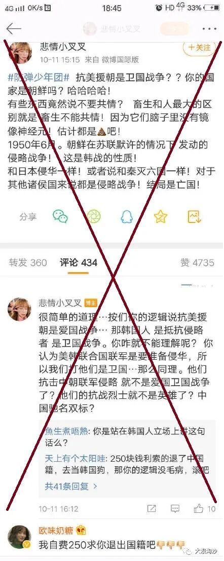 还有不少粉丝,开始积极为防弹少年团洗地,甚至洗出了魔怔,为当年李承晚法西斯政府洗地,为美国侵略者洗地,公然侮辱志愿军,践踏民族感情。他们的逻辑是:因为你反对了我加割割,我就连你支持的一起反对——标准的粉圈思维。甚至有一些粉丝唯恐天下不乱,翻墙去外网,说我们国家封杀迫害他们家割割,这就是标准的资敌行为。这些人虽然是少数,但是他们的声音非常容易放大,影响过于恶劣,比如下面这种言论,那几天在微博上比比皆是;不是因为说的人多,而是只要有人说就被全网群嘲各种转,影响极为恶劣。