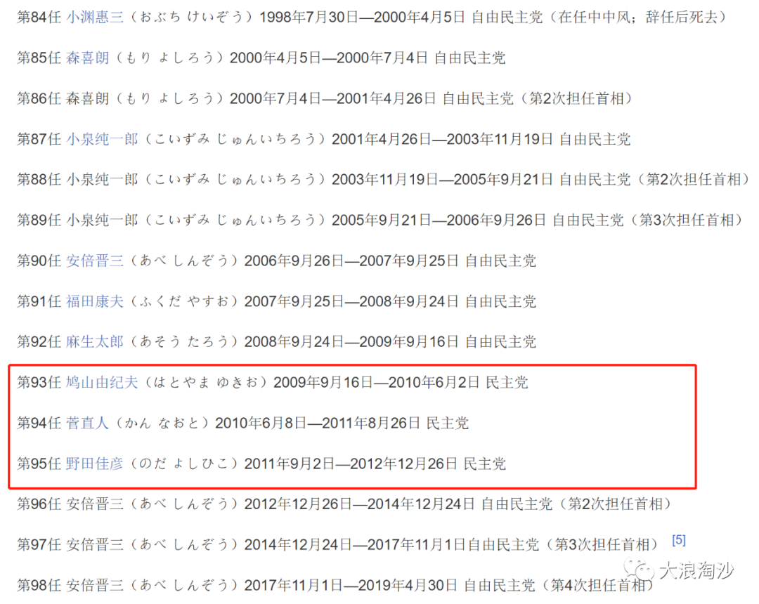 2009年,鸠山由纪夫担任日本首相;2010年,菅直人担任日本首相;2011年,野田佳彦接任。我们可以在下图中看出,这三位首相都是民主党人士——这是日本近半个世纪以来自民党执政下少有的政党轮替。
