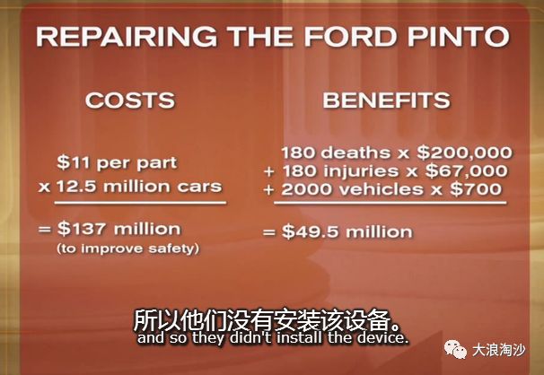 毫无疑问,福特汽车公司的这个成本效益分析备忘录在审判中出现时,震惊了陪审团,也因此裁定了福特公司巨大的赔偿金额。