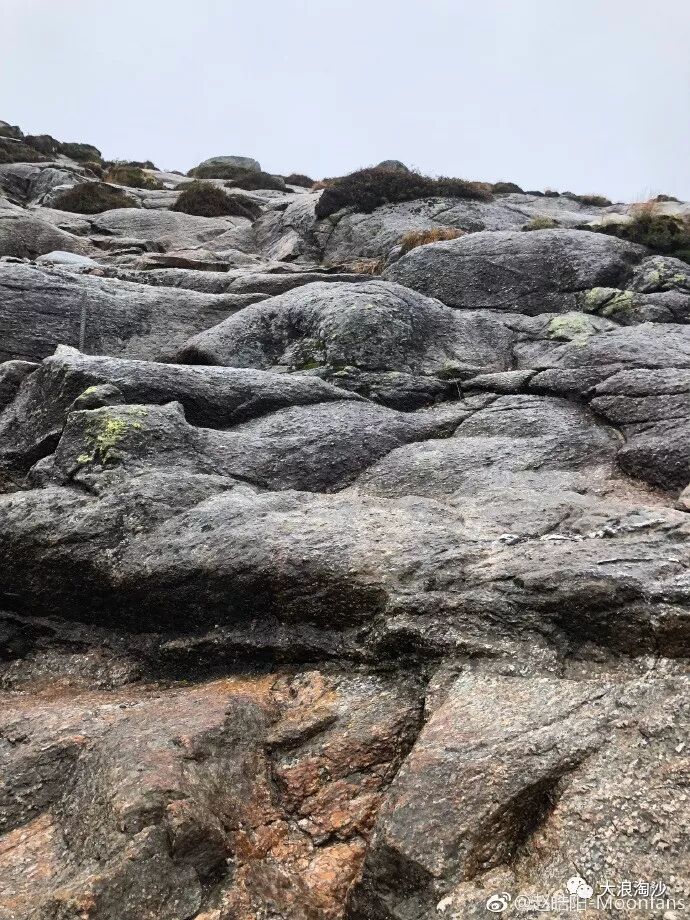 之前有个外国朋友说你们这种有台阶的山怎么能叫爬山?我算是理解啥意思了。布道岩还好,奇迹石这一路上都是下面这种路,上去就得手脚并用,下去只能屁股朝后平沙落雁式了。山上的石头本来就长满苔藓,再加上下雨,我专门在这里买的登山靴都吃不住力。还有的石头上已经结了一层薄冰,更加危险。这里山上没有修好的路,只能看公益组织DNT的志愿者们在石头上标注的“T”标识,以防迷路。(你们可以看看图里的T都标在什么地方,这就是路啊):
