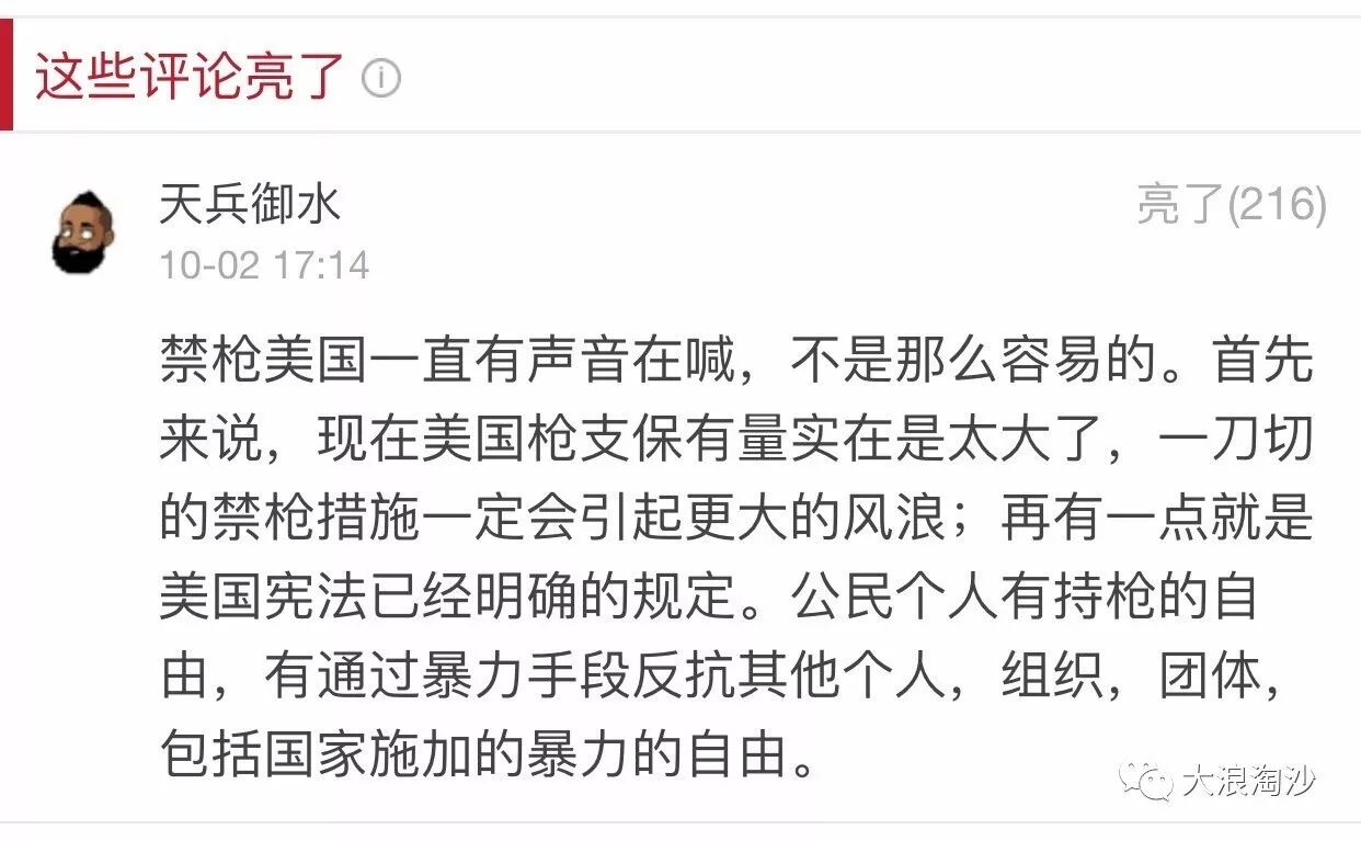 每次,但凡美国有个枪击案,尼玛绝对会在社交网络和新闻评论区看见上面这种蛋疼的说法。什么叫宪法规定反抗“国家施加的暴力”,宪法我上面写了,就那两句话“纪律严明的民兵是保障自由州的安全所必需的,人民拥有和携带武器的权利不可侵犯”,中国网友们不顾打字的辛苦,强行给美国宪法加戏,这是什么精神,这真是伟大的国际主义精神。