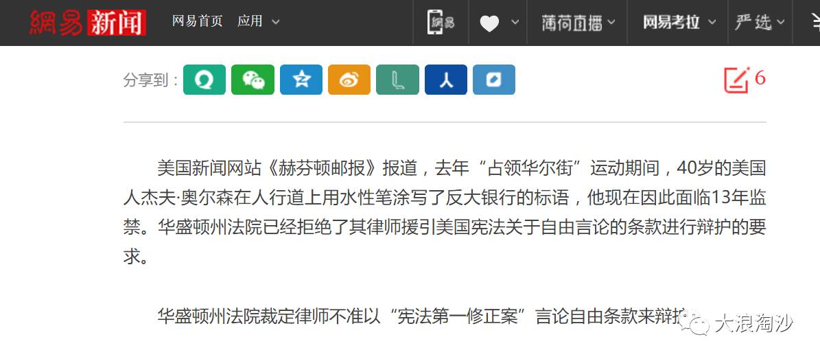 【占领华尔街抗议者被判13年监禁 律师被禁止援引宪法言论自由条款】美国新闻网站《赫芬顿邮报》报道,去年“占领华尔街”运动期间,40岁的美国人杰夫·奥尔森在人行道上用水性笔涂写了反大银行的标语,他现在因此面临13年监禁。华盛顿州法院已经拒绝了其律师援引美国宪法关于自由言论的条款进行辩护的要求。