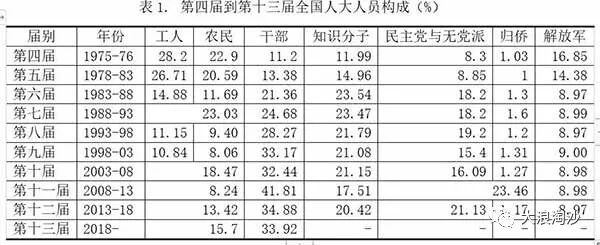 人大代表这一块,我放一个工农人大代表的比例,来源:王开峰《论人大代表的构成》。不多说,大家看数据。