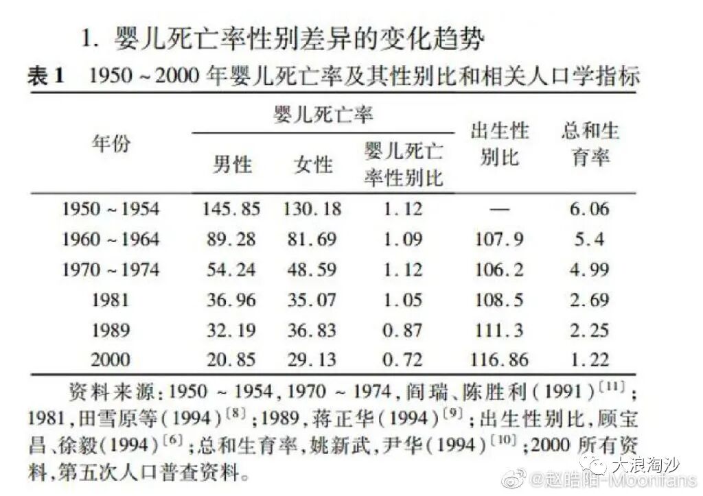 先看女婴死亡率(下图):从上世纪八十年代开始,女婴死亡率急剧上升,而且丝毫没有遏止的趋势;死亡性别比从50年的1.12,骤降到2000年的0.72——这意味着在2000年,每20.85个死亡男婴对应着29.13个死亡女婴。很明显,这不是一个自然数字。同时,男女婴儿出生比,从60年代107.9升高到2000年的116.86,每100个新生女婴,对应116.86个新生男婴。