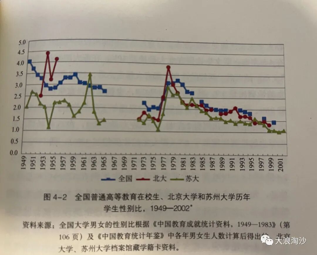 高等院校入学率。以下内容和数据,来源于《无声的革命》这一本书——1964年毛泽东称:“时代不同了,男女都一样。男同志能办到的事情,女同志也能办得到。”这句话不仅变成“文化大革命”口号之一,也是推动中国男女平等的动力之一。因此,到“文革”时期,高等教育领域内的男女平等发展到了一个高峰。全国和北大的男女性别比都被降到了2:1左右,苏州大学在1976年前后更是达到了均衡的1:1。但是,在1976年之后,女性比率以一个诡异的斜率大跌,一路接近到1949年的水平,随后才逐年恢复正常。