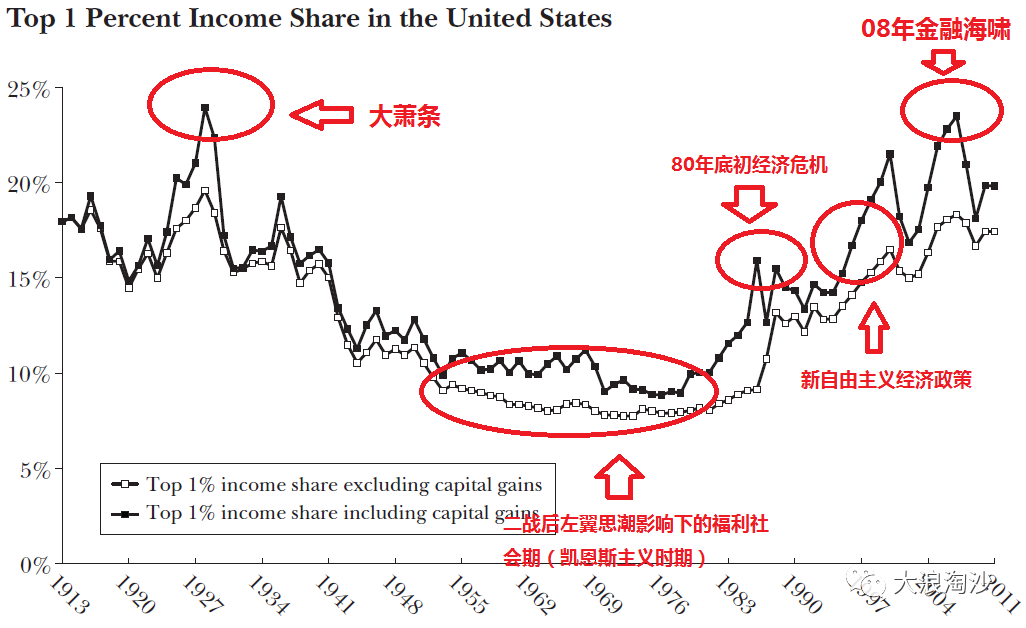 所以美帝开的这个倒车,其实是历史必然。白左“政治正确”式的烟花礼炮,并不能掩盖两极分化的加剧。下面这张图来自《二十一世纪资本论》,红色的字是我加的,反映的是贫富分化趋势。