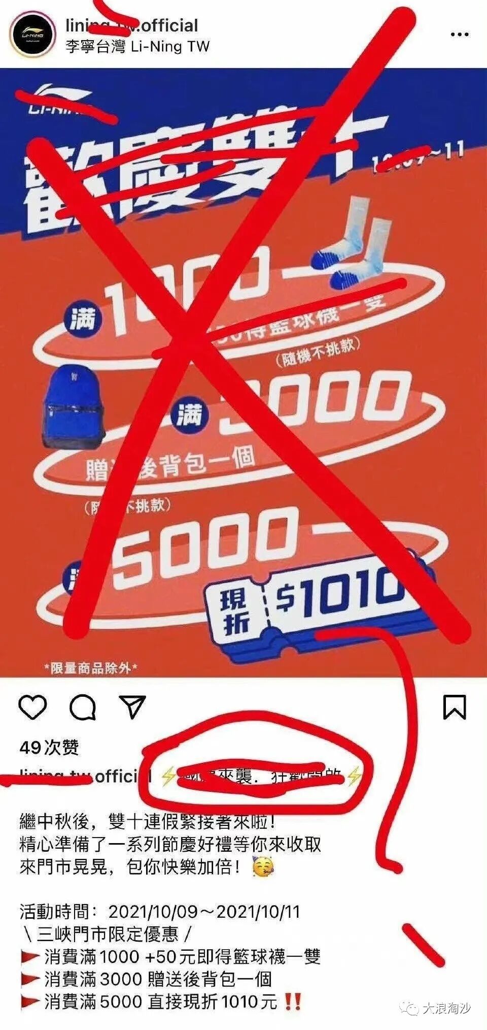 中国人不给中国人搞优惠,然后李宁在台湾伪政权的“双十节”搞促销搞得挺积极。