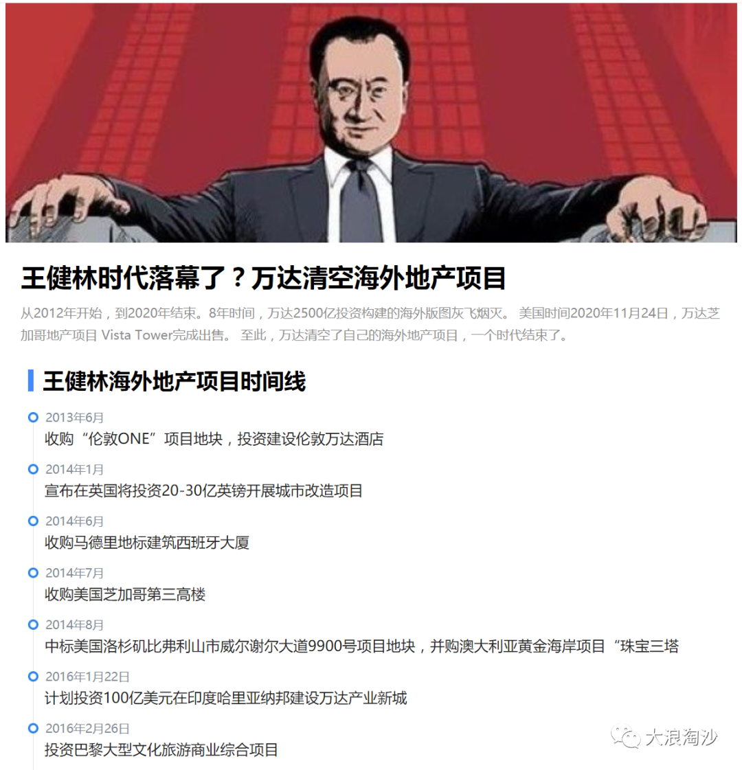 2017年7月,就在王健林父子被传言“谈话”的前后,网上流传出一份《关于银监会口头转达对大连万达集团股份有限公司六个境外项目处理措施的情况汇报文件》。该文件显示,由于万达集团六个境外投资项目涉及近期我国对外投资严格管控的领域,拟对包括万达总投资 10 亿美元收购的美国北欧院线、总投资12亿美元的美国卡麦克院线等在内的六个项目严肃处理。
