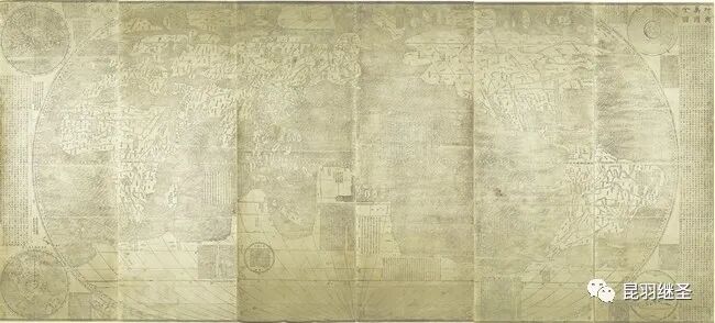 《坤舆万国全图》一直被认为是国内现存最早的、第一幅绘制出美洲的世界地图(南京博物院藏本为明万历三十六年宫廷中的彩色摹绘本)。