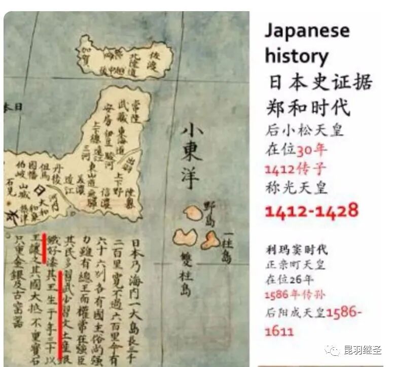 《坤舆万国全图》在日本地图旁的注释说,(日本国)“其王生子,年三十,以王讓之“。日本后小松天皇(应称国王而非“天皇”)在位30年,于1412年“传子”,称光天皇。光天皇在位时期是1412-1428年,恰好是郑和全球远航时代,被及时记入《坤图》,顺理成章!而利玛窦时代的日本是正亲町天皇在位26年,于利玛窦来华4年后的1586年传位给孙子后阳成天皇。