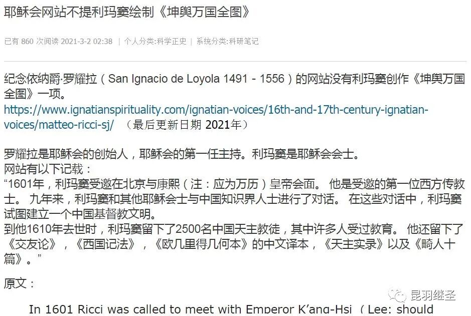 2021年 耶稣会辖下的主要团体网站删除利玛窦绘制《坤舆万国全图》的条目和网页。