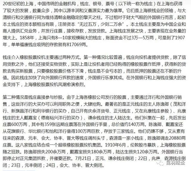 可怕的是,以实力最为雄厚的源丰润和义善源为首的众多钱庄、银号、票号通过贷款、直接炒股的方式也参与了橡胶股票投机。