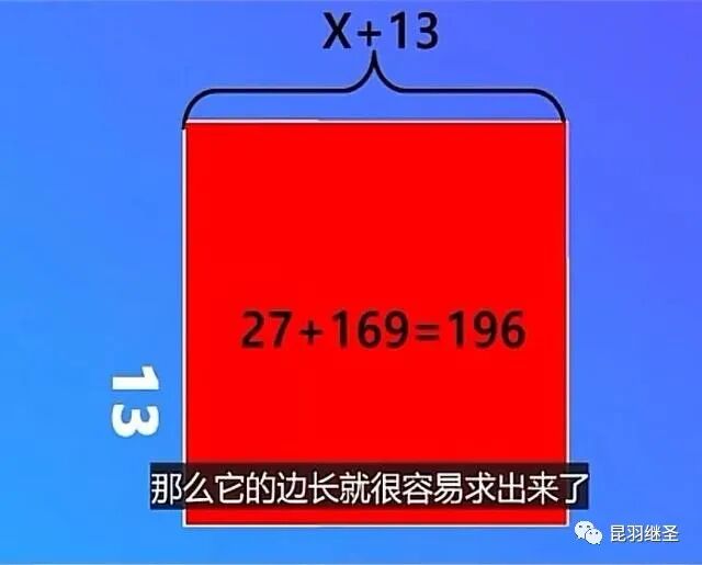 不难发现,这个组合面积的边长都是13+X,因此很容易得出边长=14,从而算出13+X=14,而X=1。