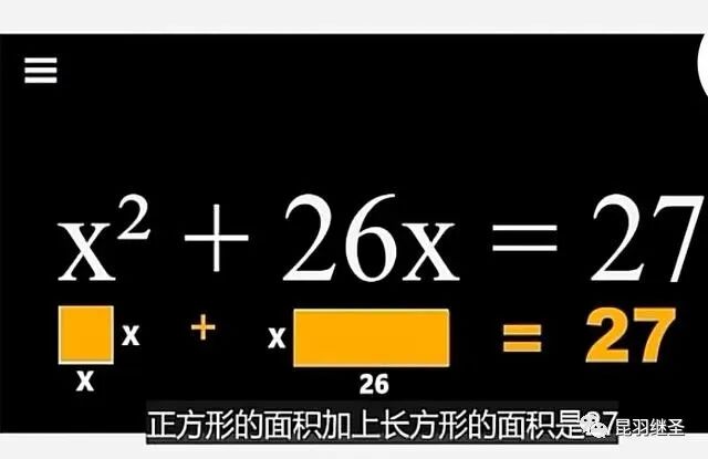 那么,以象形思维模式来思考的话,刚才这道题X²+26X=27,我们怎么解决问题呢?