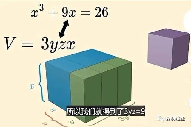 以X³+9X=26为例,经过类似前述的方法,重新切分和组合,可以组成一个新的立方体,而通过计算和降元处理,发现最终又回到了解一元二次方程的问题上。