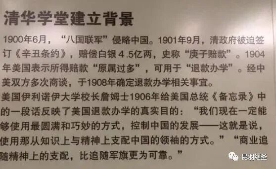 在全国数一数二的高等学府的校史馆中,在清华学堂建立背景栏中有提及1906年美国伊利诺伊大学校长詹姆斯写给美国总统的《备忘录》中有一段话,非常明确地阐明了建校目的。