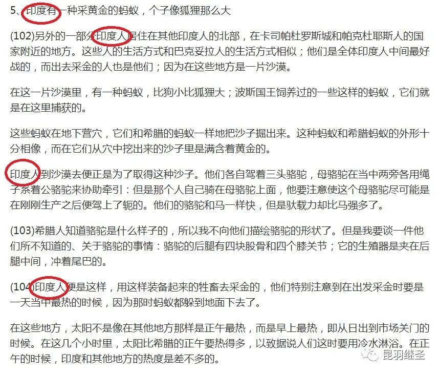 历史第三册中,希罗多德称他在波斯见到有一种大型蚂蚁,个头像狐狸一样大,浑身是毛,喜爱在沙地上挖土,拉出金色的灰尘颗粒。