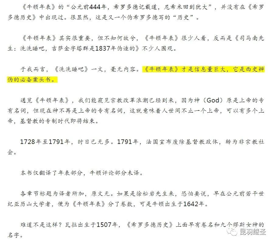 其实,古希腊史纪年法、编年史都是在大名鼎鼎的物理学家、数学家、法国公鸡会会长艾萨克·牛顿所著《古代诸国修订年表》基础上编造而成的,马拉松战役、希腊波斯战争、西元前585年5月28日日全食等事件都在1728年排出。