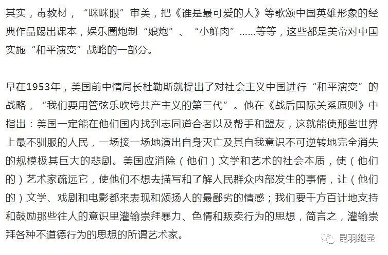 “当有一天,中国的年轻人不再相信我们老祖宗的教导和他们的传统文化,我们美国就不战而胜了。”
