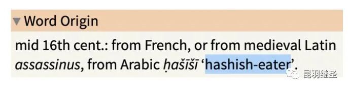 Assassin的真正词源前面已经简述过了,是阿拉伯语的 Hashish-eater(吃迷药的人)。