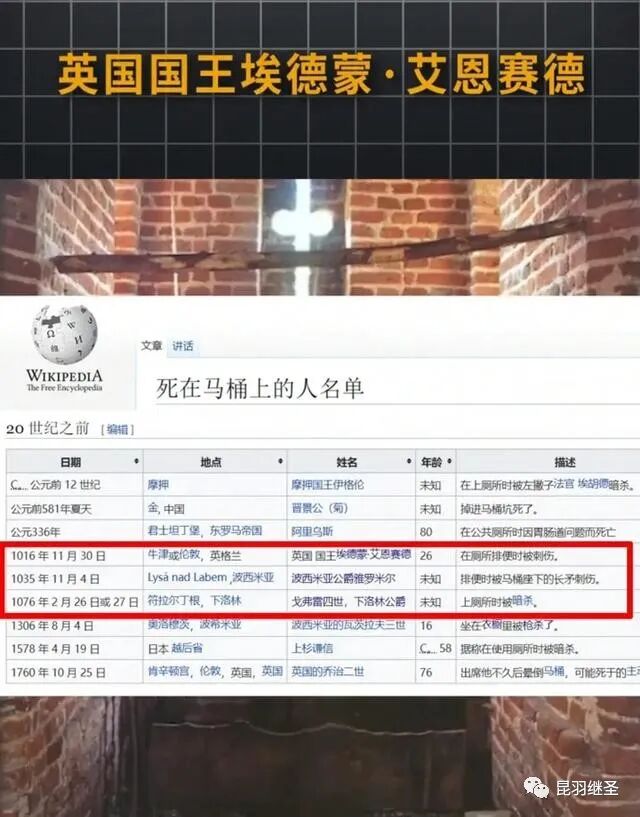 英国国王埃德蒙艾恩赛德在厕所排便时被刺伤;波西米亚公爵雅罗米尔在排便时被马桶座下的长矛刺伤;下洛林公爵戈弗雷四世在上厕所时被成功暗杀。