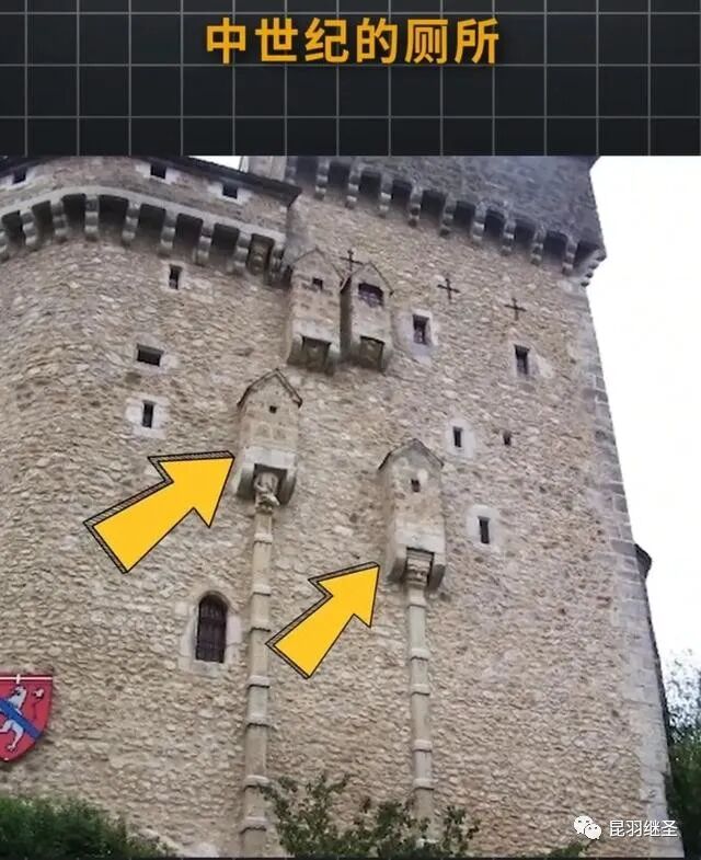 如下图所示,中世纪的厕所是盖在墙上的,蹲坑的位置下面,连着长长的通道。拉出来的便便会沿着管道,从高空坠落,掉进蓄池或护城河。掉进蓄池的,则有下人拿着工具定期处理。