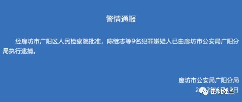 6月12日,据河北廊坊市公安局广阳分局通报:经廊坊市广阳区人民检察院批准,陈继志等9名犯罪嫌疑人已由廊坊市公安局广阳分局执行逮捕。