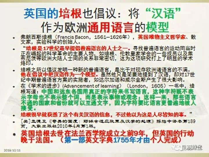 “雅言”即“表意”,中文在这方面是独一无二的原创,而西方是在17世纪末才开始摄取它(从汉语“借取含义、借鉴定义”),正是从这个意义上讲,鉴于欧洲是从汉语雅言借取含义、借鉴定义,从而分享了中文内涵,古今西方的“文明”及其所有方面(包括古典经典、名人名著),都是使用“汉语密码”塑造或伪造的。不少学者经过研究认为,在此以前,中文之外的语言文字则都是方言土话俗语(无法成体系去承载文明)