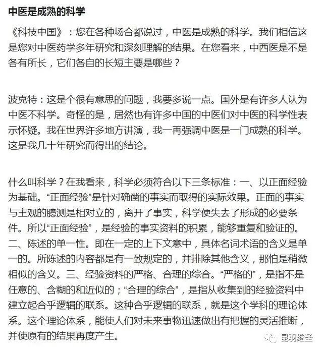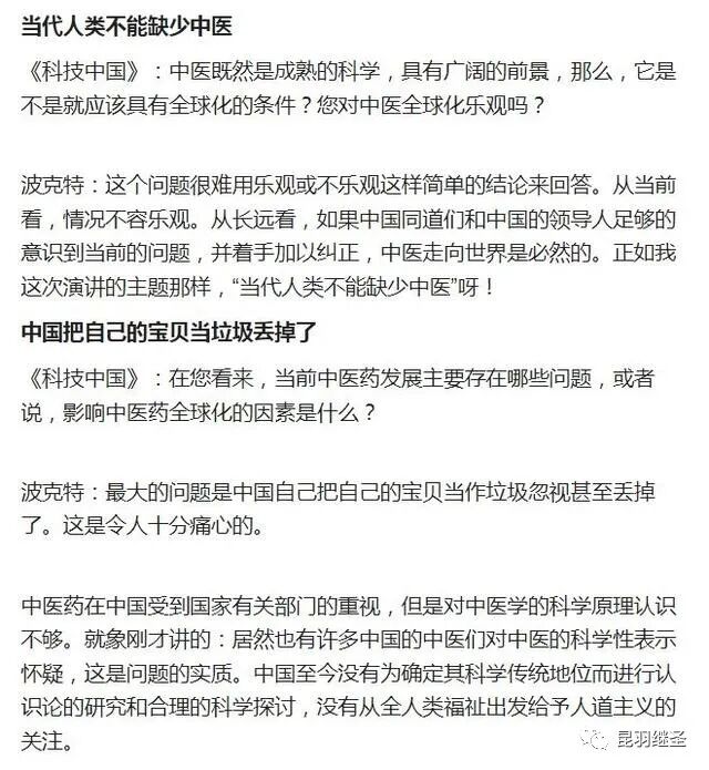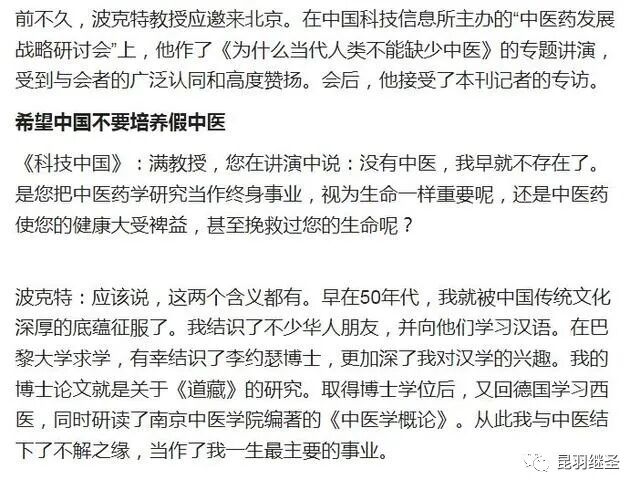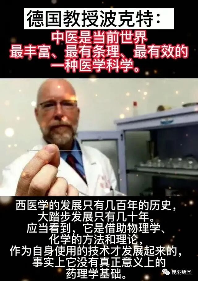 与李约瑟齐名的德国慕尼黑大学教授曼福瑞德·波克特Manfred Porkert坦言:“西方医学已进入方法学的死胡同,当代人类不能缺少中医。希望中国不要培养假中医。”