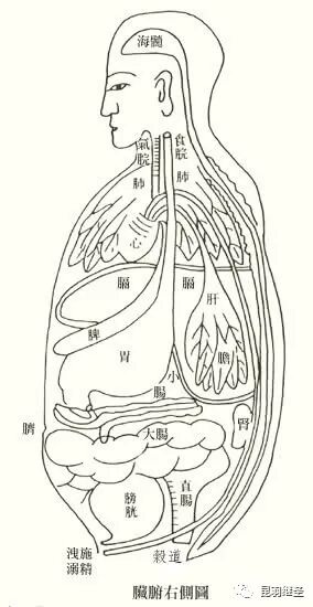 “肺之下则有心、肝、胆,脾胃之下有小肠,小肠下有大肠,小肠皆莹洁无物,大肠则为滓秽。大肠之旁有膀胱……肾则有二,一在肝之右,微下,一在脾之左,微上。脾则在心之左。”