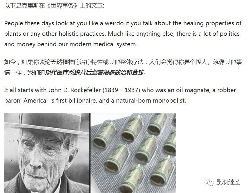 上述行为带来的结果是,100年后的今天,西方炮制出的医生对营养、草药或任何整体实践一无所知,人类自身的健康被这些大企业所奴役。