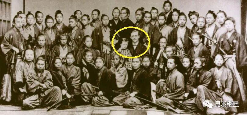 人群中处于绝对C位的外国人是公鸡会会员 Guido H . F . Verbeck ,此人与旁边的一众人等建立了现代化的日本