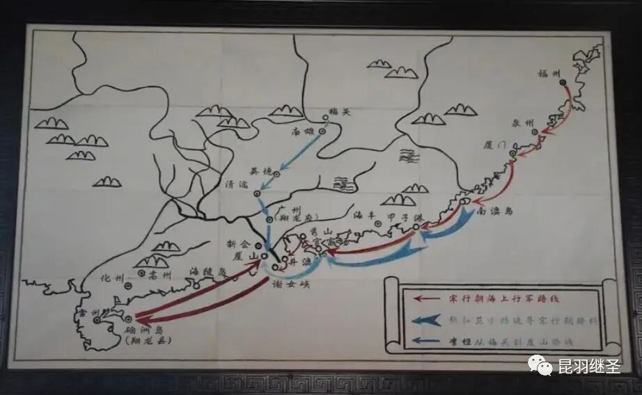 随后,南宋大臣陆秀夫、张世杰、文天祥退守岭南,等拥立年仅八岁的卫王赵昺(bǐng)为帝,改年号祥兴,迁居至广东新会县南80里海中的小岛崖山。