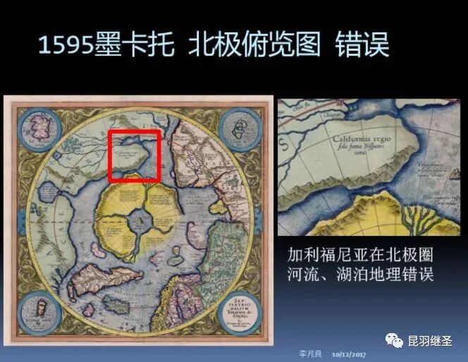 假如1602年的《坤舆万国全图》是抄本,地图资料来源于1595年的墨卡托地图,那么墨卡托地图存在的错误,《坤舆万国全图》因为照抄,必然也会有。然而,墨卡托地图中的加州居然被画在了北极圈内,这显然是个明显的错误,可是在《坤舆万国全图》中,加州的地位位置却准确无疑。