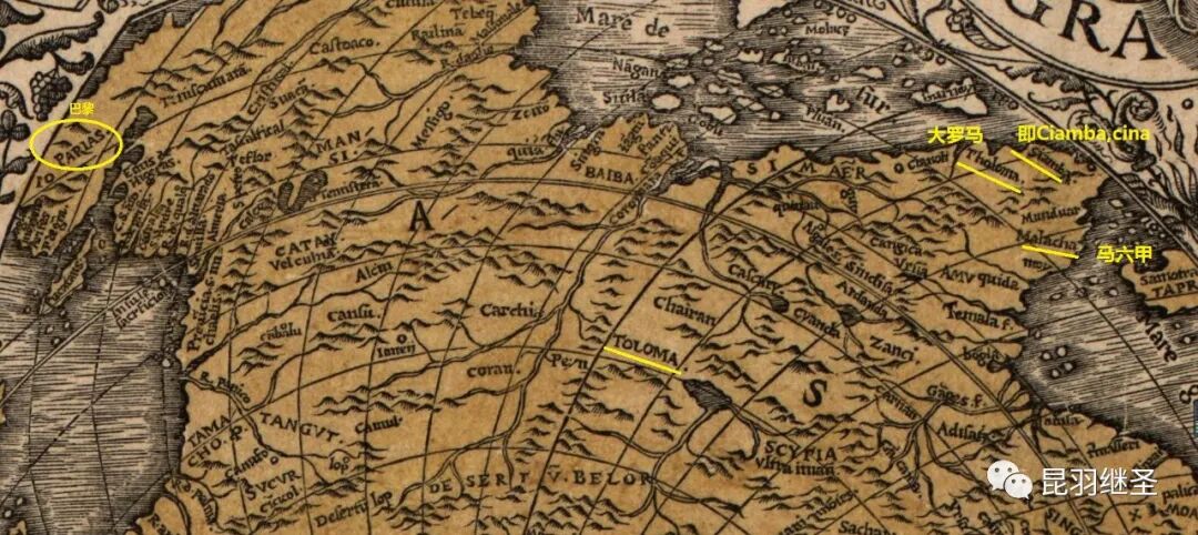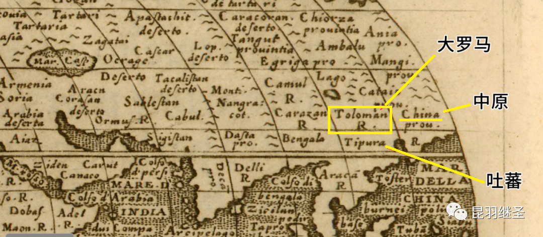 在这幅地图中(从北极上空的俯视图),中国也被称为Ciamba,而旁边就是大罗马(Tholoma)。此外,在亚洲ASIA的A和S之间,也横空出现了一个Toloma。这个位置看起来很像是吐蕃(西藏)的方位。