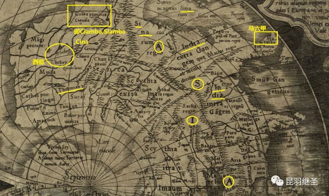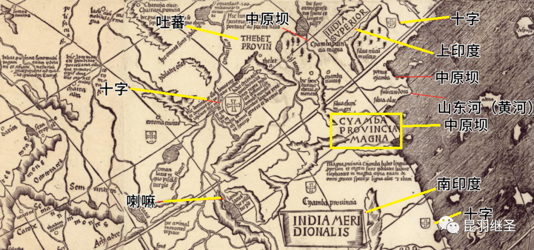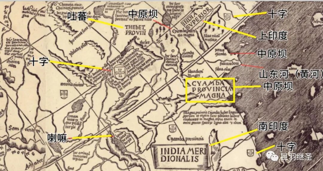 而在上印度和南印度之间,标注的是“Cyamba Provincia Magna”。“Cyamba”就是“大中原坝”(“C”按传教士音为[z]),“Magna”为拉丁语,意即“巨大的,伟大的”。