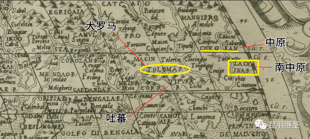 在墨卡托地图中,华中地区中原坝也被改称为Ciamba,而Tholoman出现在了吐蕃(西藏)以西的位置。