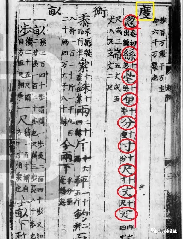 “田曹云度之所起,起于忽。十忽为一丝,十丝为一毫,十毫为一氂,十氂为一分,十分为一寸,十寸为一尺,十尺为一丈,十丈为一引,四丈为一匹,五丈为一端,六尺为一步,二百四十步为一畞,三百步为一里。”