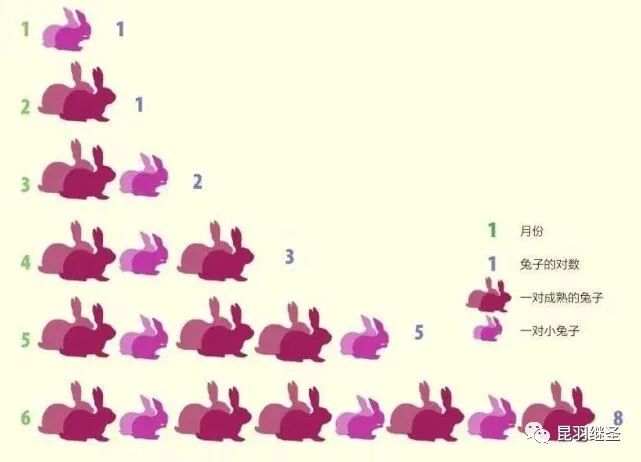 斐波那契发现每月的兔子数都是前两个月的数量之和。