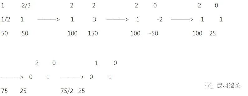 法曰《九章详注比类演算法大全》:“甲欲乙中半,乙母二分子之一;乙欲甲之太半,甲母是三分子之乃之二。以甲母三分乘乙钱五十,得一百五十,复以乙母二分乘甲钱五十得一百。以少减多,乙钱余五十,半之得乙钱二十五。复以乙钱二十五,甲钱一百,以少减多,甲钱余七十五,半之得甲钱三十七文半。”