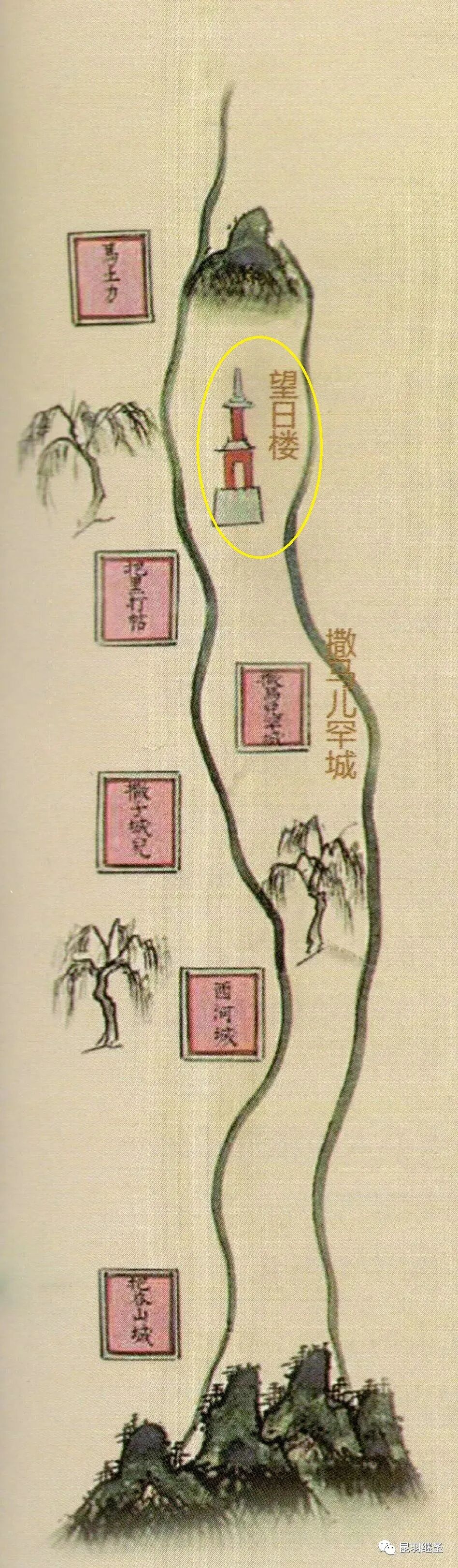 《西域土地人物图》图中有大量类似汉地庑殿顶式的建筑,比如撒马尔罕北侧的“望日楼”。在台北故宫博物院藏彩绘本的《西域土地人物图》中,它被表现为红色的有着中国式屋顶的高台建筑。