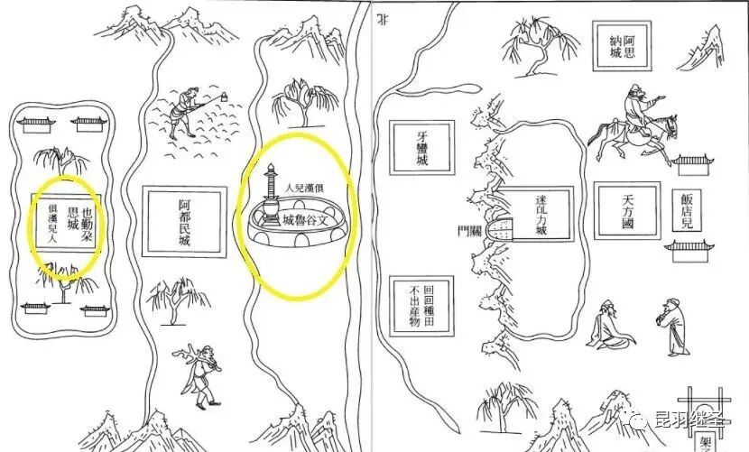 又西为文谷鲁城,俱汉儿人,蓬头带帽儿,种旱田,出珊瑚树、眼镜石。
