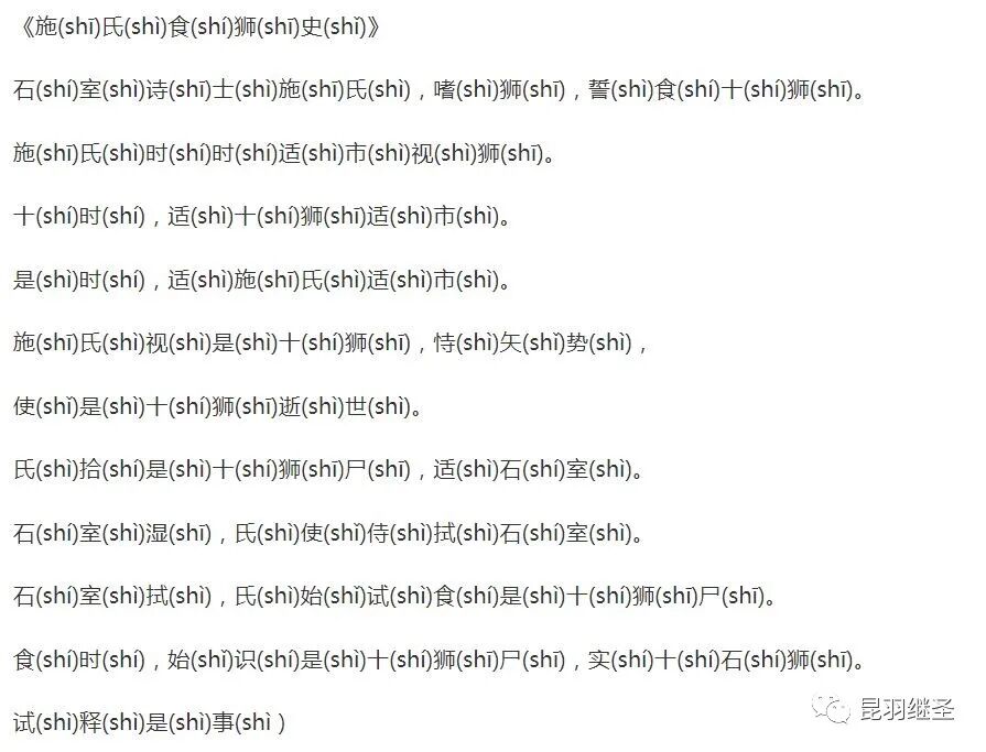 《石室诗士食狮史》全文计94字(后扩充为103字,连同题目7字,共110字),每个字的普通话发音都是shi,原文如下: