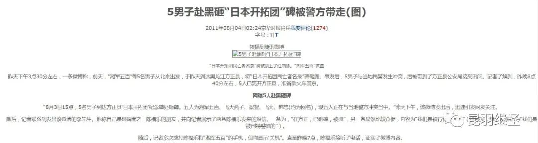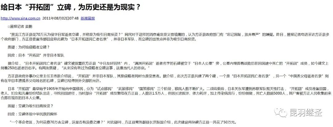一则是黑龙江某县花费70万人民币为岛国开拓团立碑的事情