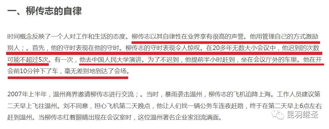 该课本中有一篇文章,名曰《守时的柳传志》。文章将柳大咖盛赞了一番,称其是一个非常守时的人,参加活动几乎没有迟到过,甚至有时会提前半个小时或一个小时到达。